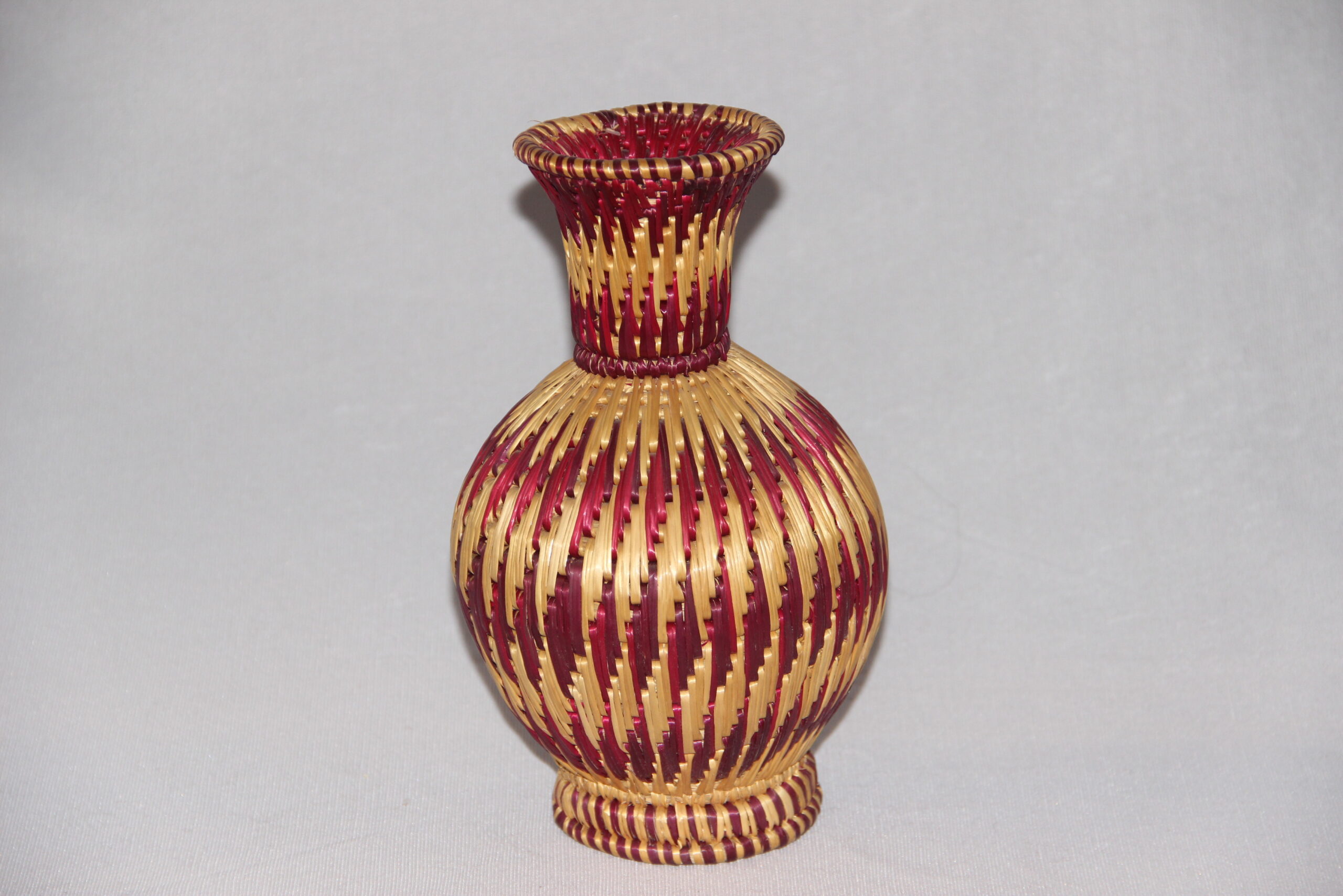 This Sikki grass vase boasts a rich red maroon dye, enhancing its visual appeal. Crafted with precision and care, it’s a fine example of Sikki grass handicraft. Measuring a modest size, it stands as an exquisite home decor piece or a thoughtful gift choice. The combination of natural material and vibrant color makes it an eco-friendly and visually captivating addition to any living space