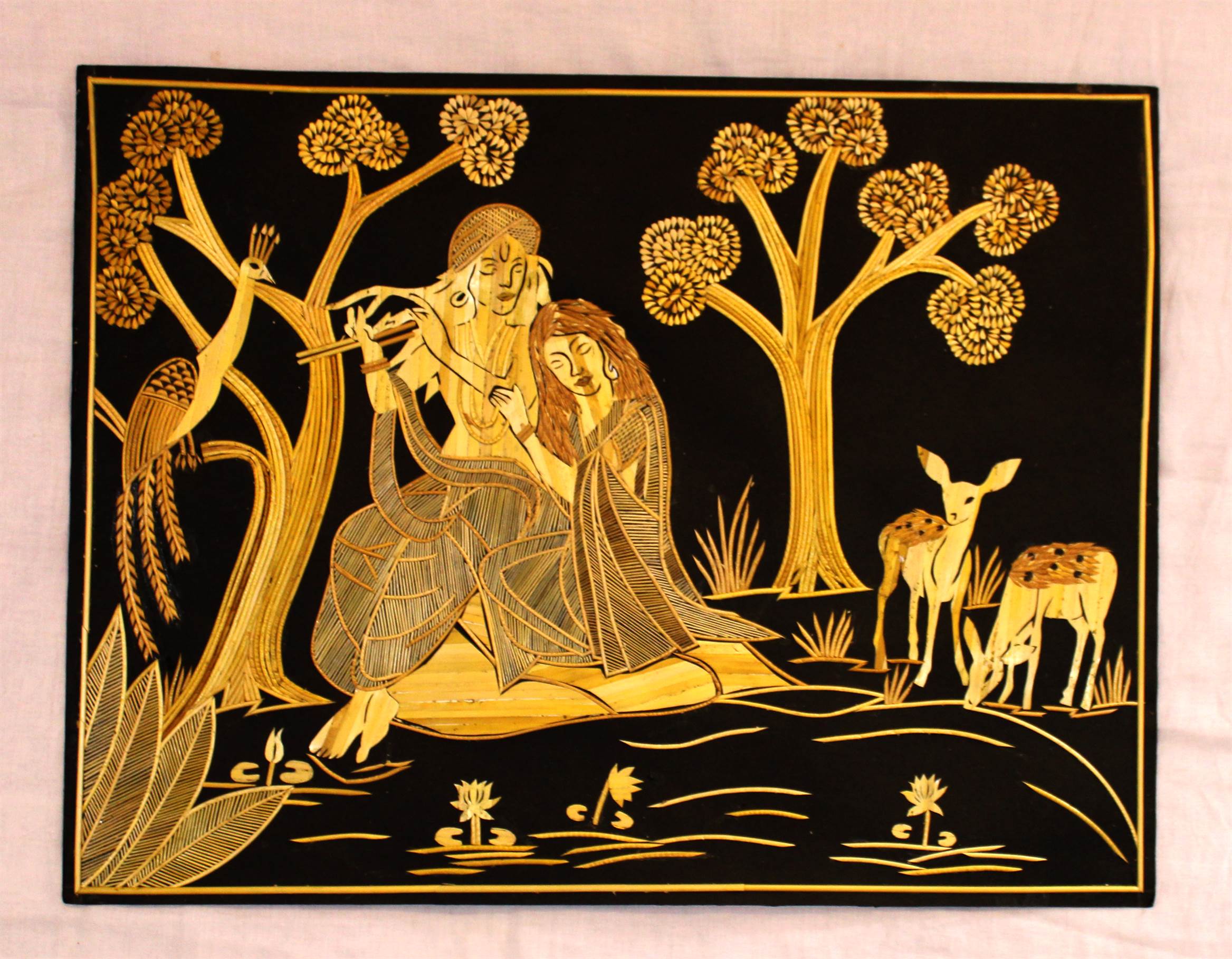 On the other side, a resplendent peacock gracefully unfurls its iridescent feathers, dancing to the melodious tunes, as if offering a celestial performance to the divine couple.This artwork serves as a testament to the deep love between Lord Krishna and Radha, where the beauty of nature harmonizes with their divine connection. It invites you to witness the magic of their love, the allure of Krishna’s music, and the wonders of the natural world.